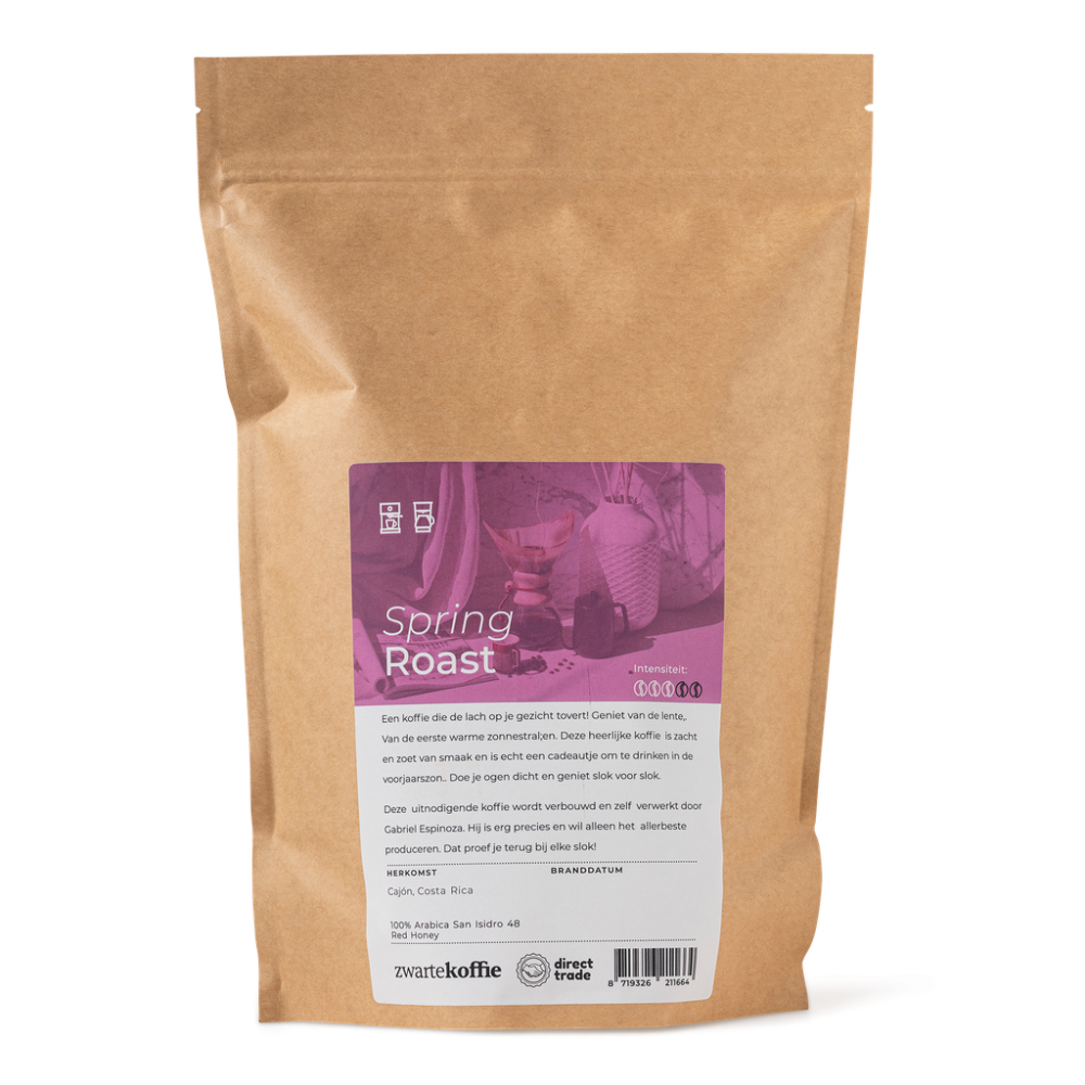 Spring Roast lentekoffie is een betoverende koffie die perfect past bij het voorjaar. Deze koffie wordt gekenmerkt door zijn unieke zoete smaakervaring, door de Black Honey methode waar koffie zonder water van de schil wordt ontdaan na het plukken.